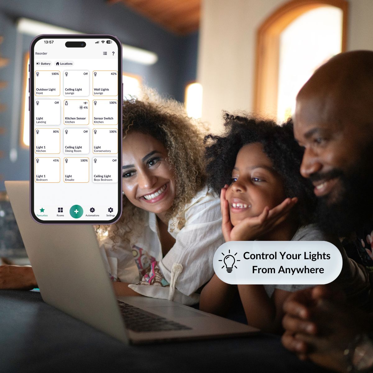 Whether you’re managing your lighting circuits, motorised curtains, or non-smart electrical devices, Lightwave gives you full control from anywhere. Use the Lightwave app to remotely activate or deactivate your connected devices, ensuring your home is always just the way you want it, whether you’re at home or away.